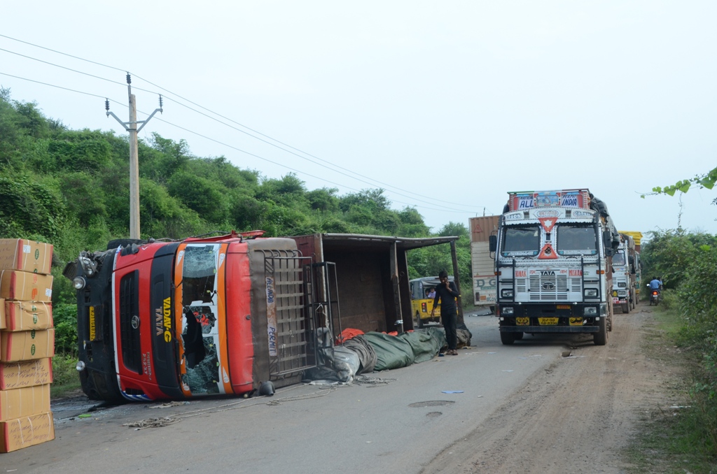 ट्रक पलटा, टैंकर हुआ टेड़ा,लगा जाम
